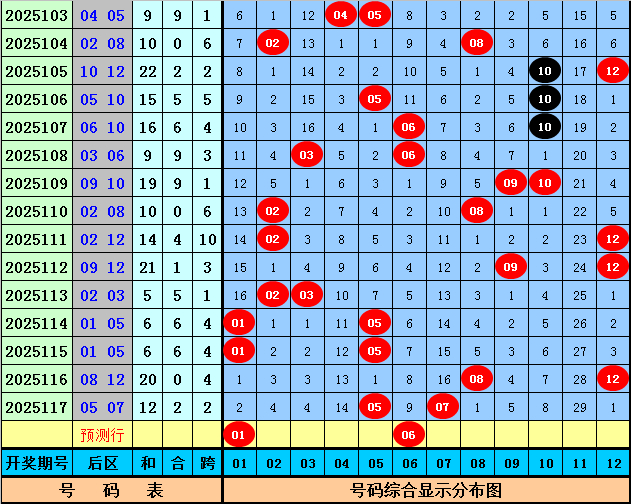 后区分析:上期该位开出奖号05和07,和值为12,跨度为2,后区前4次开出和值12和跨度2时,其下期奖号分别为:04+10、01+12、10+11、02+05,号码奇偶比为3:5,大小比为4:4,012路比为1:4:3,本期后区号码参考01、02、04、06、07,精选两码01、06。